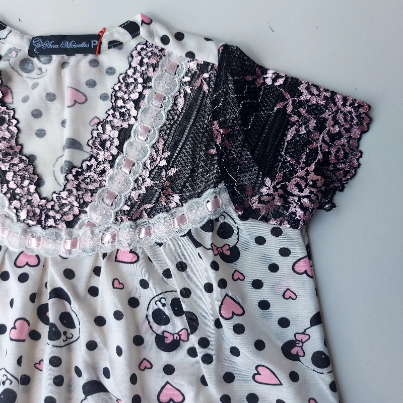 COR: Malha fundo creme estampa urso panda Renda preto com Rosa