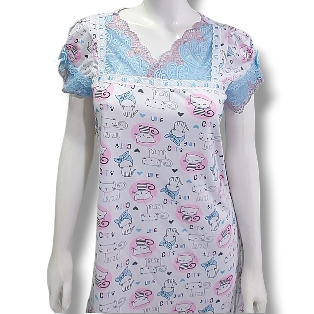 COR: Malha fundo branco com estampa gatinha,Renda azul com Rosê Golden